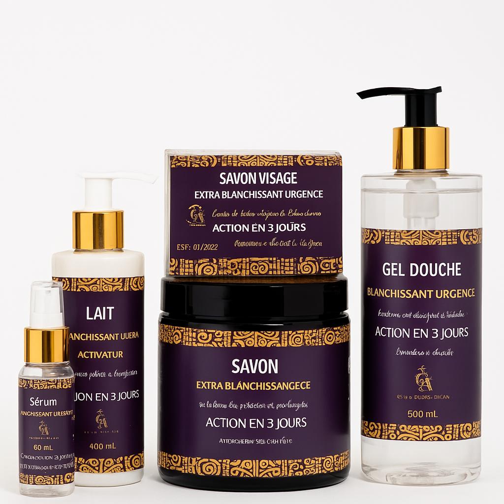 La gamme Urgence Extra Blanchissante est spécialement conçue pour éclaircir la peau et réduire l’apparence des taches. Voici une brève description de chacun de ses produits :